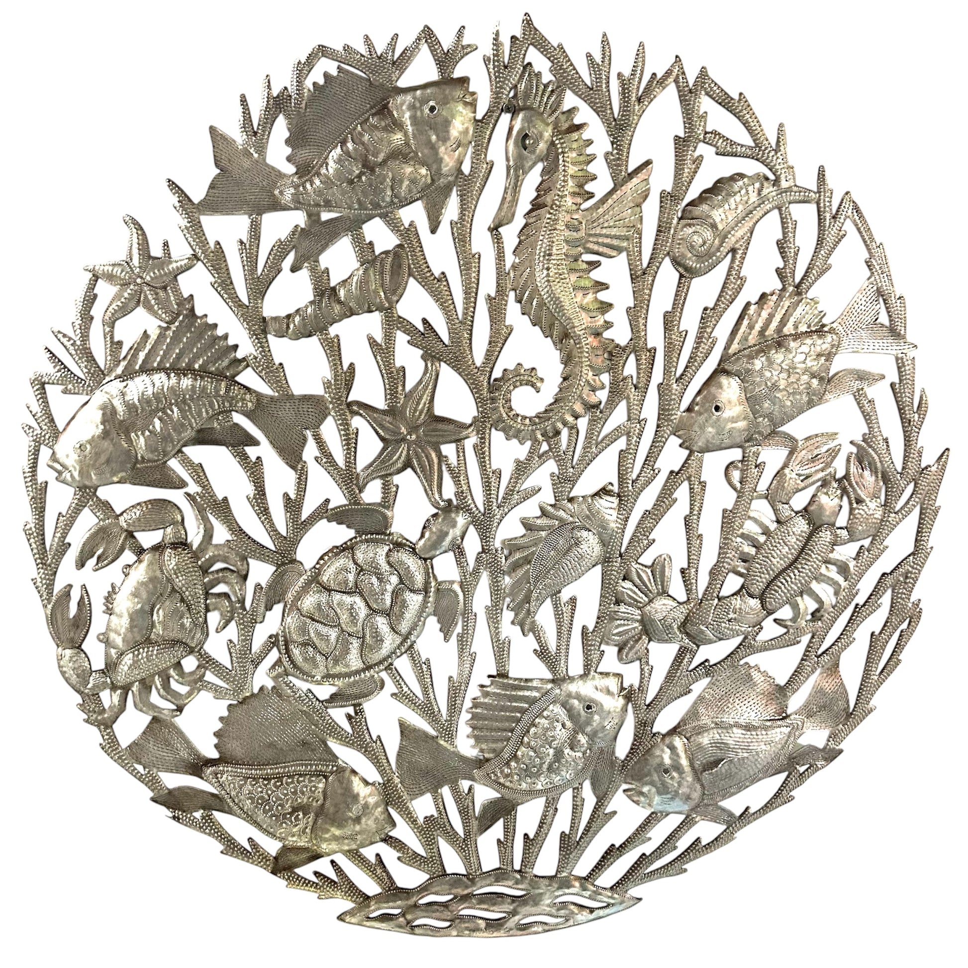 One of the most celebrated Haitian art forms, steel drum art is always a winner! Each piece is hand crafted from recycled 55 gallon drums using only a hammer and a few small tools that resemble railroad spikes. Each piece is a true work of art!