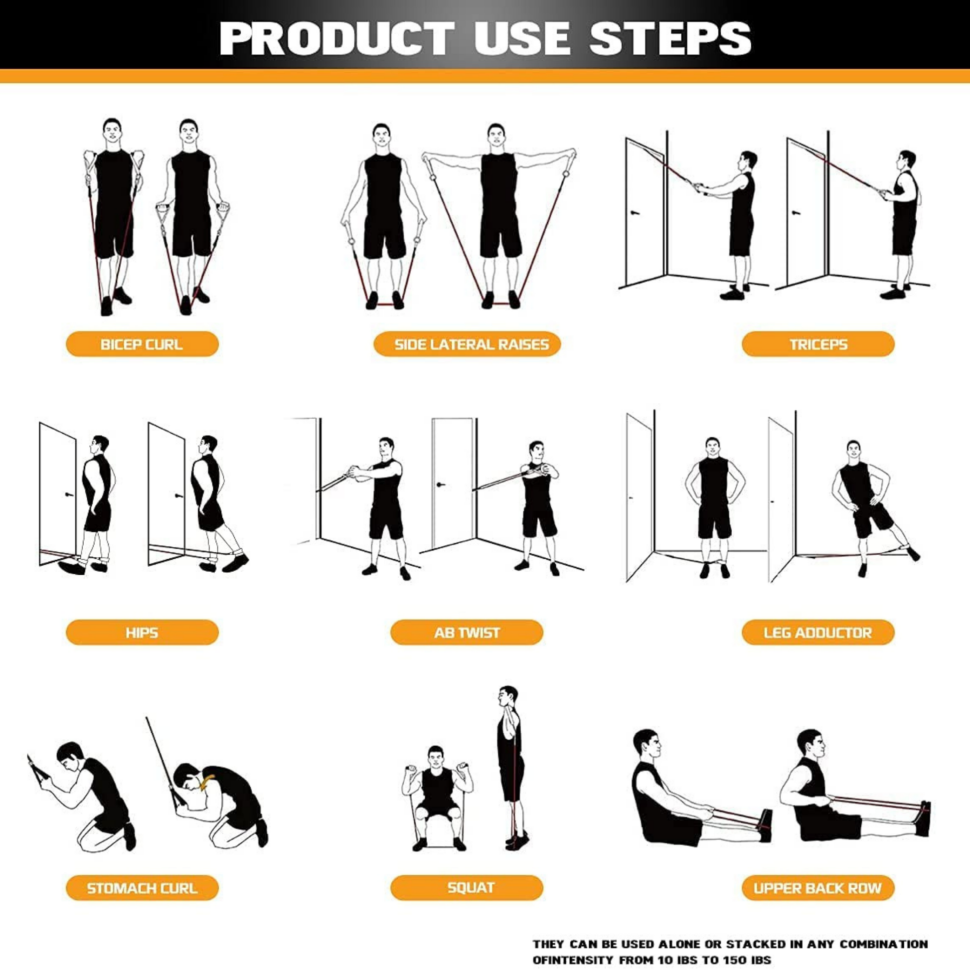 This set offers stackable resistance bands with 5 different resistance levels. When used together, these stackable bands provide a maximum resistance level of up to 150LBS.