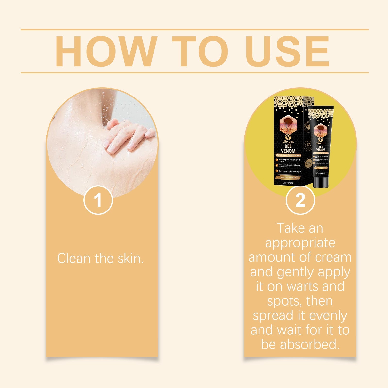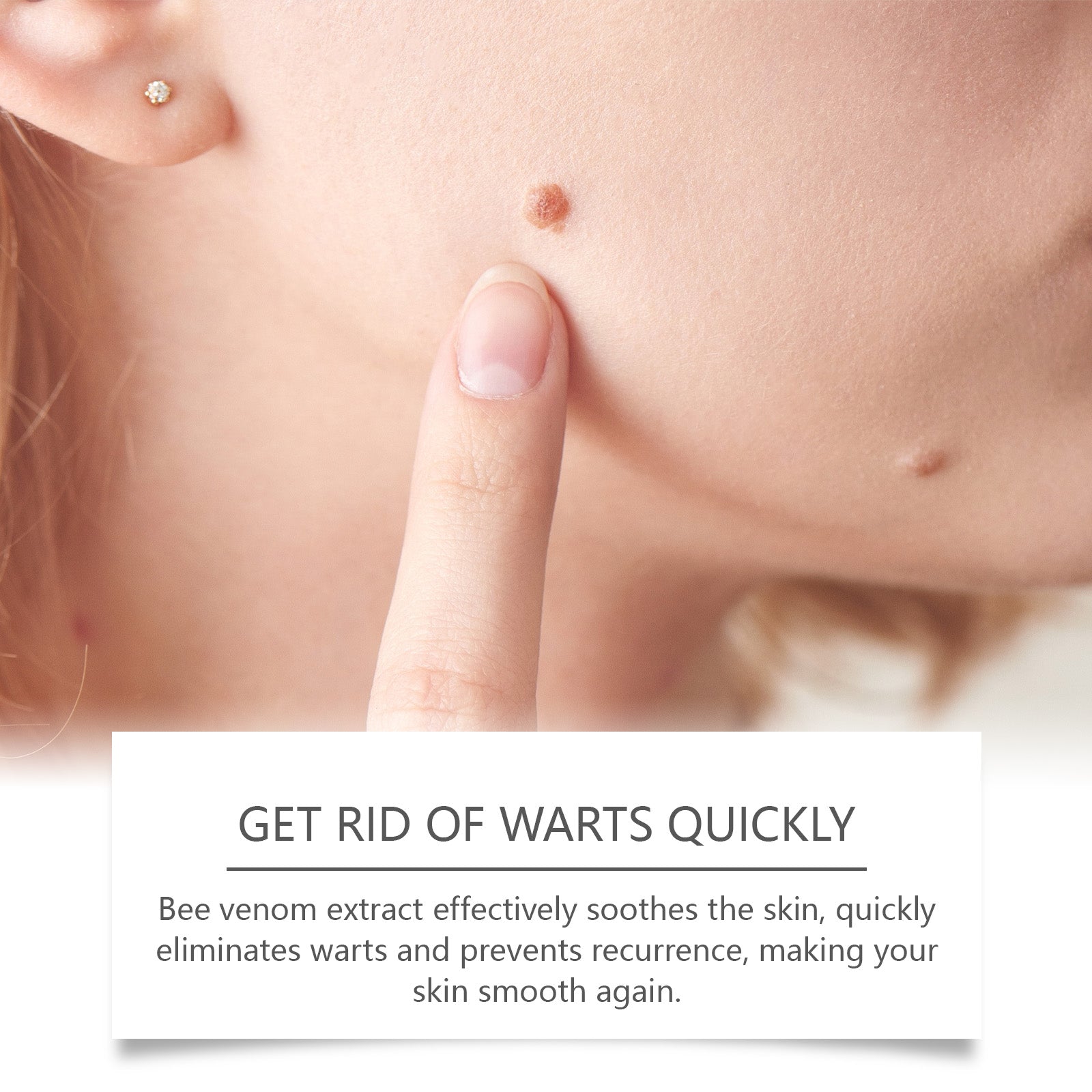 Our Kew cream contains bee venom, ceramide and vitamin D3. It can be aimed at warts and gently removed to restore smoothness. Inhibit the regeneration of blemishes and make the skin more even after long-term use. The way to use it is simple: 1. Clean the skin. 2. Take a proper amount of the cream and gently apply it to the warts and spots, then evenly apply it and wait for absorption. Bee venom extract can effectively soothe the skin, quickly remove warts, prevent recurrence, and make skin smooth again.