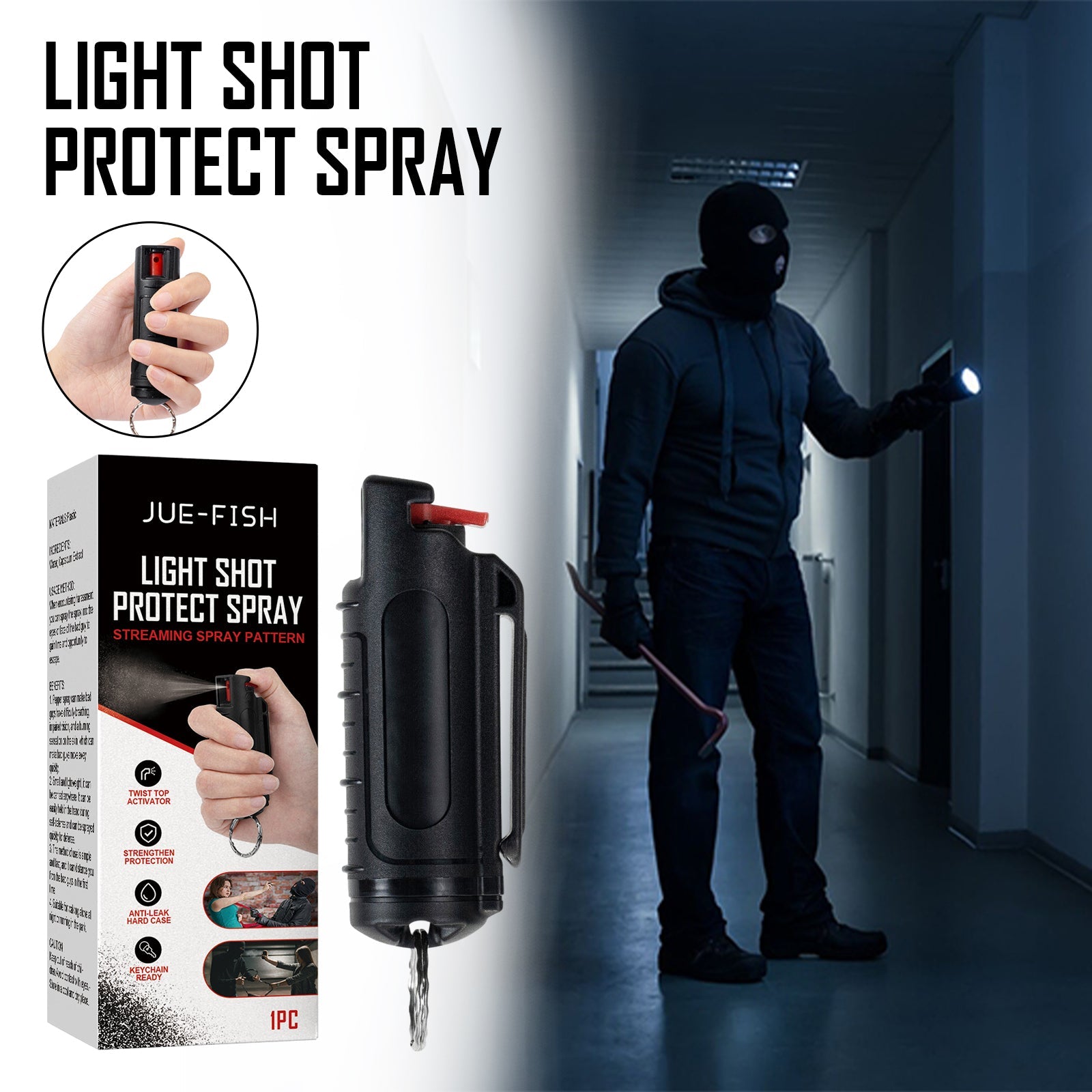 Our keychain contains water, chili extract. It can cause a burning sensation in the eyes, skin and nose; Invisible UV dye for marking attackers; Irritates the respiratory system and causes coughing. The way to use it is simple: When confronted with harassment, you can spray the spray into the eyes or face of the bad guy to buy time and a chance to escape. Pepper spray can make bad guys have difficulty breathing, impaired vision, and a burning sensation on the skin, which can make bad guys leave quickly.