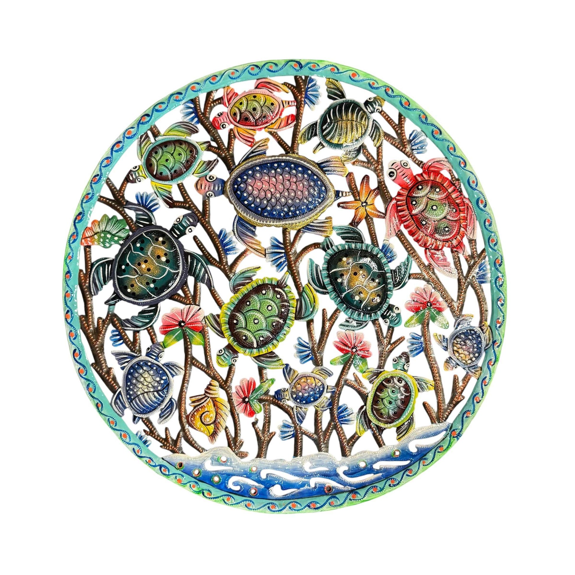 One of the most celebrated Haitian art forms, steel drum art is always a winner! Each piece is hand crafted from recycled 55 gallon drums using only a hammer and a few small tools that resemble railroad spikes. Each piece is a true work of art!