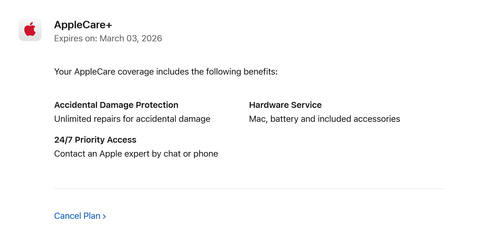 Warranty: It comes with AppleCare+ until 03/03/26 and 90-Day SafeTech Warranty with options to upgrade up to 3 Years.