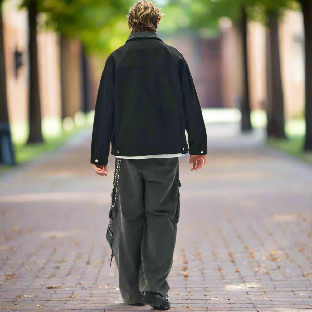 This bomber jacket’s loose fit and lapel collar design in beige, khaki, green, or black create a bold, contemporary vibe. Its trendy aesthetic makes it a standout choice for effortless smart-casual outfits.