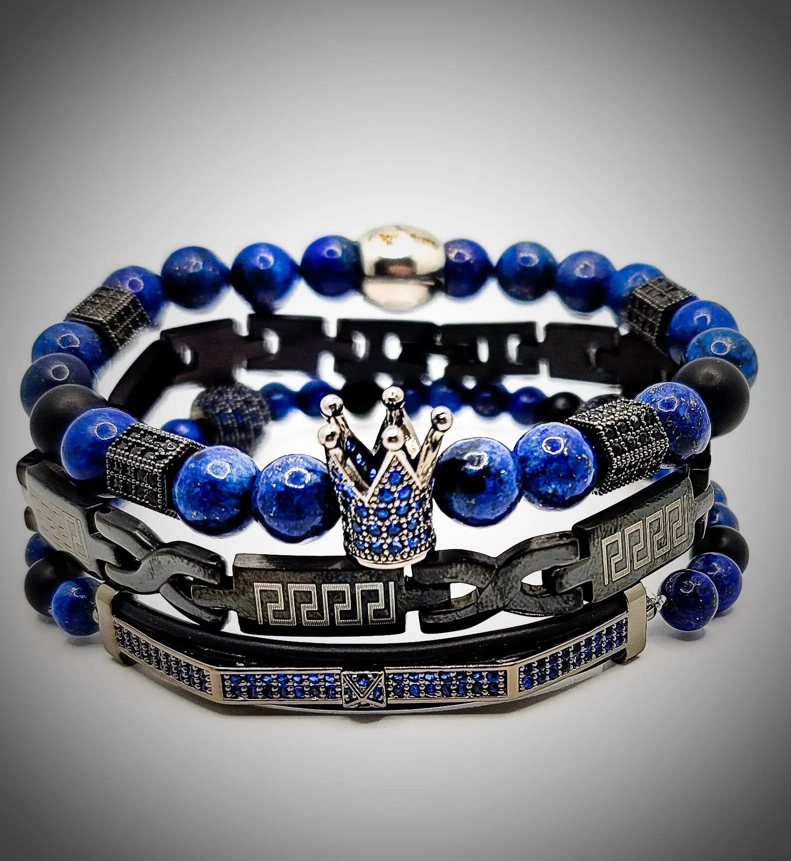 This 3pc. Set is made with 8mm lapis Lazuli and smooth onyx beads with black micro pave' spacers amd crown. Comes with stainless steel bracelet. This fantastic 3pc. Set is made with 8mm lapis Lazuli and smooth onyx beads with black micro pave' spacers and, with black micro pave' spacers & crown, 18" stainless steel chain,& lobster claw clasp. Comes with gift box. This turquoise, lapis lazuli, and onyx bracelet features a stainless steel Claddagh style bracelet with a crown. With this royal design, you will have a look of royalty. This 3pc. Set is made with 8mm lapis Lazuli and smooth onyx beads with black micro pave' spacers and a crown. With the stainless steel bracelet, you will have a look for any occasion.
