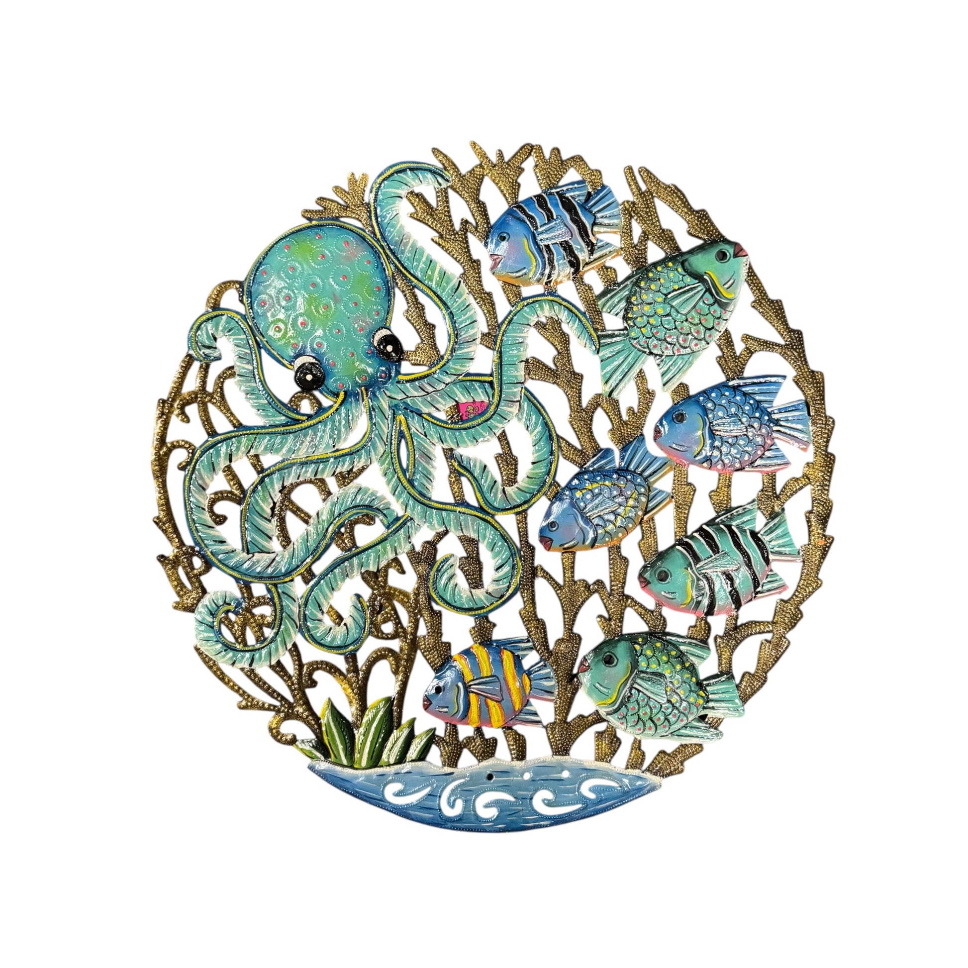 One of the most celebrated Haitian art forms, steel drum art is always a winner! Each piece is hand crafted from recycled 55 gallon drums using only a hammer and a few small tools that resemble railroad spikes. Each piece is a true work of art!
