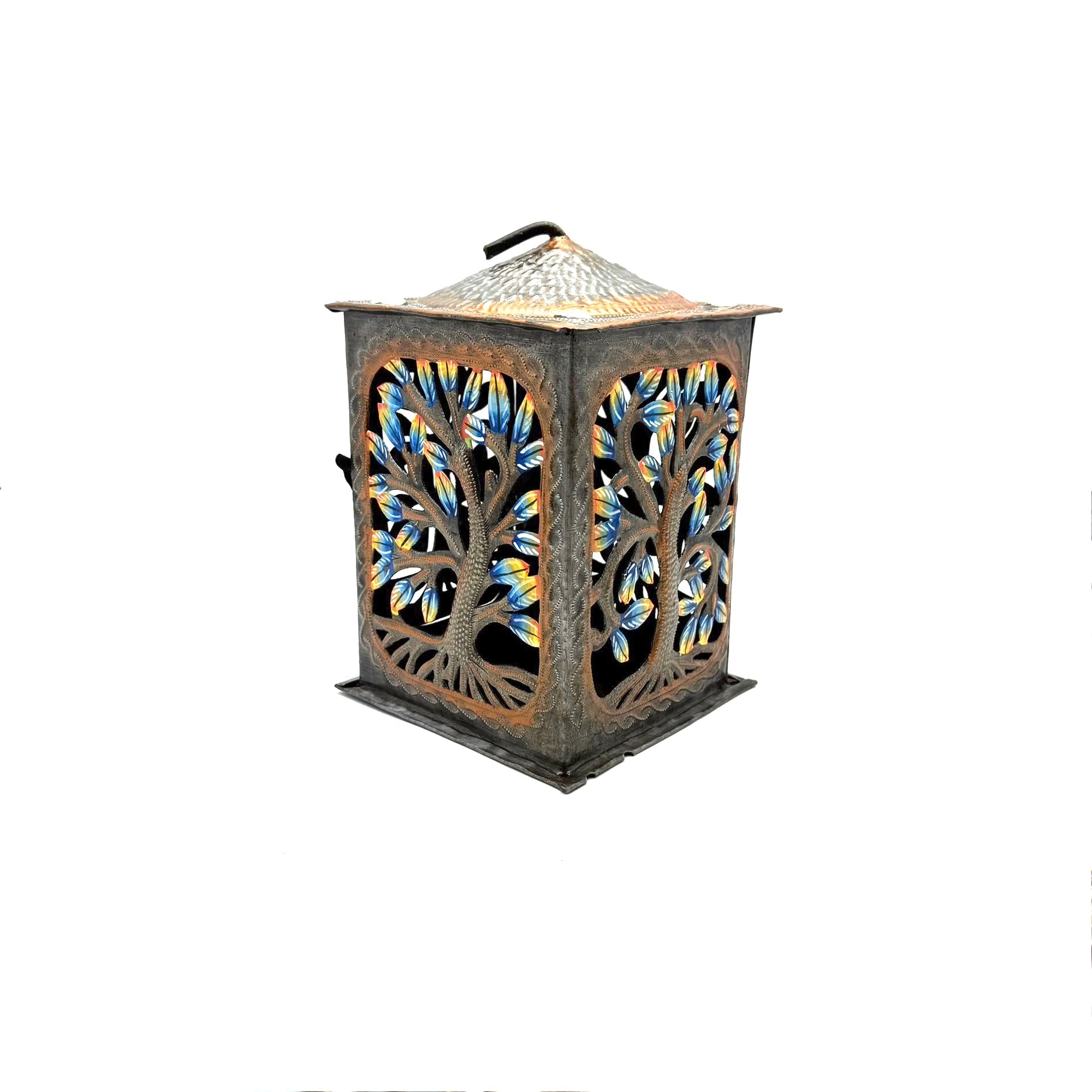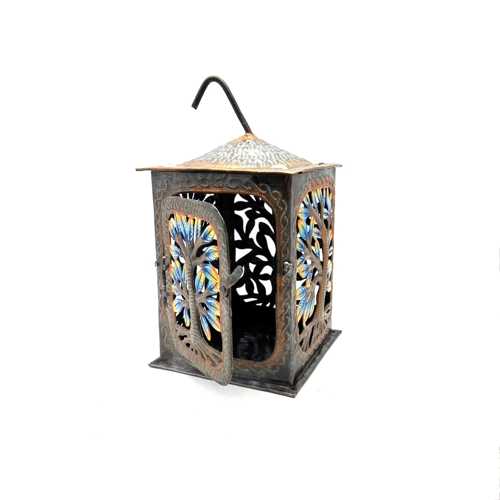 Painted Tree of Life Hanging Lantern- Blue/Bronze