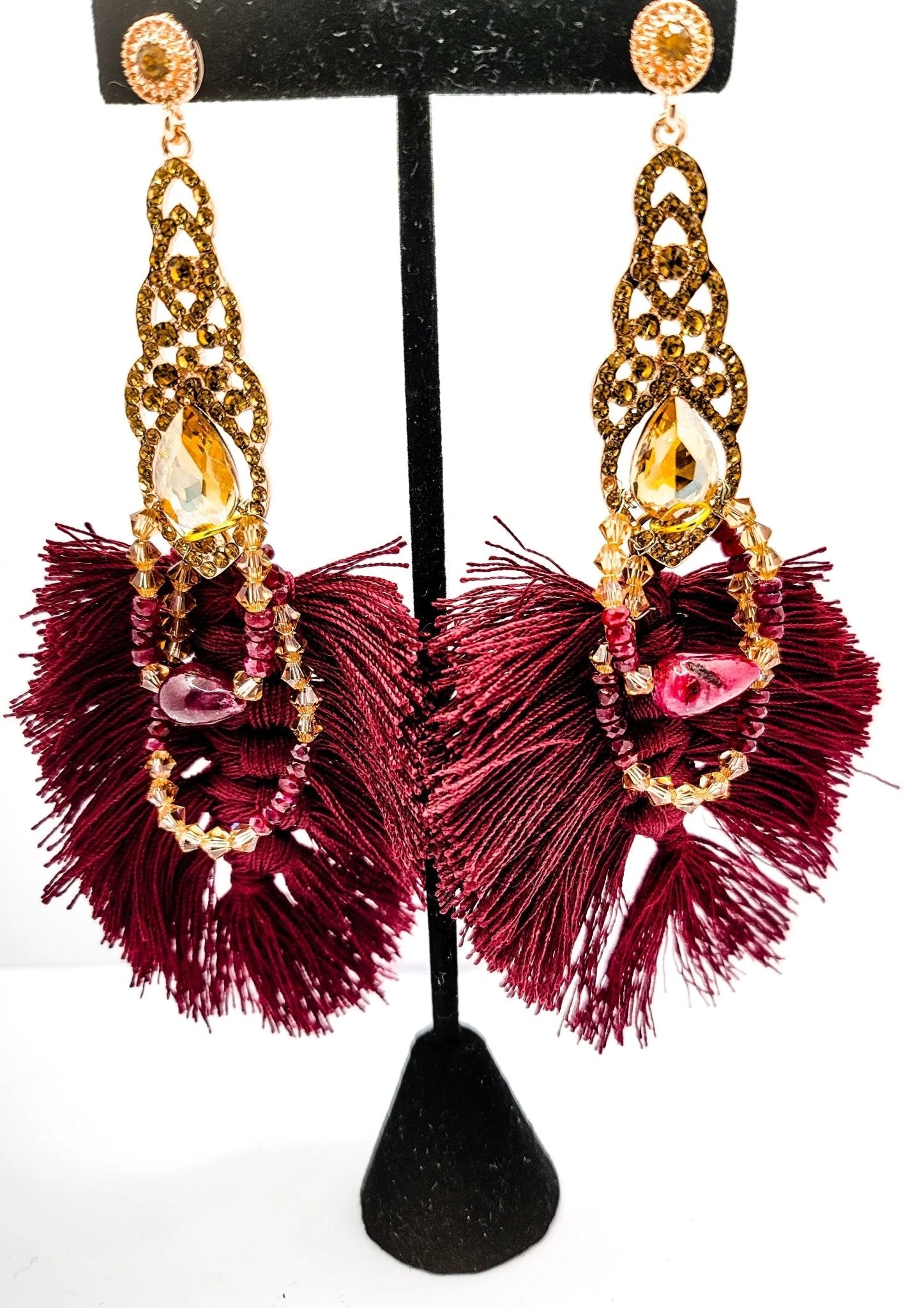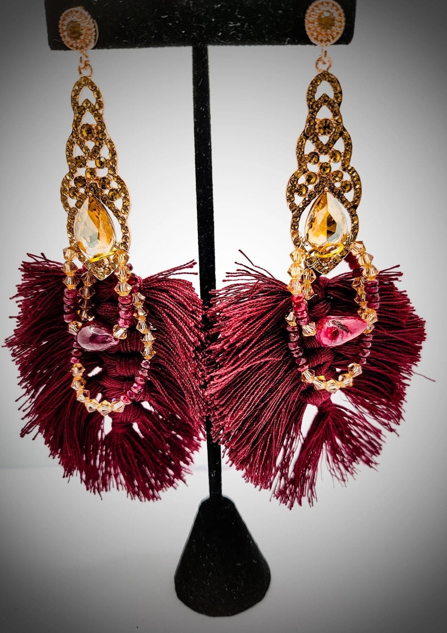 These unique designed burgundy tassel earrings are very unique and beautiful! These statement earrings goes with style ! Depends on if you want to be bold and unique and stand out with your everyday and work wear or just wear for a special occasion! Based is made with amber Austrian crystals and burgundy died silk tassel. The 2 loop lines are made with natural Rubies and amber Swarovski crystals.