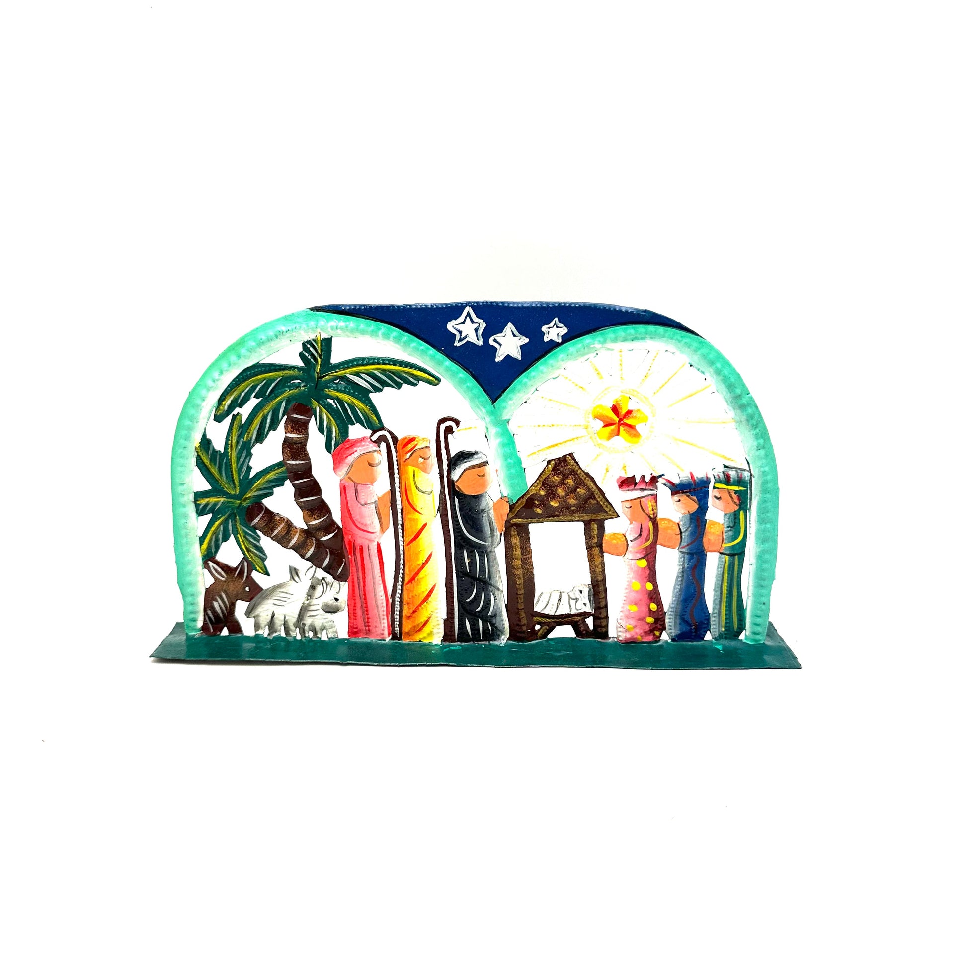 Each steel drum piece is hand hammered and chiseled into an amazing work of art. Metal art nativities are proven to be a best seller year after year!