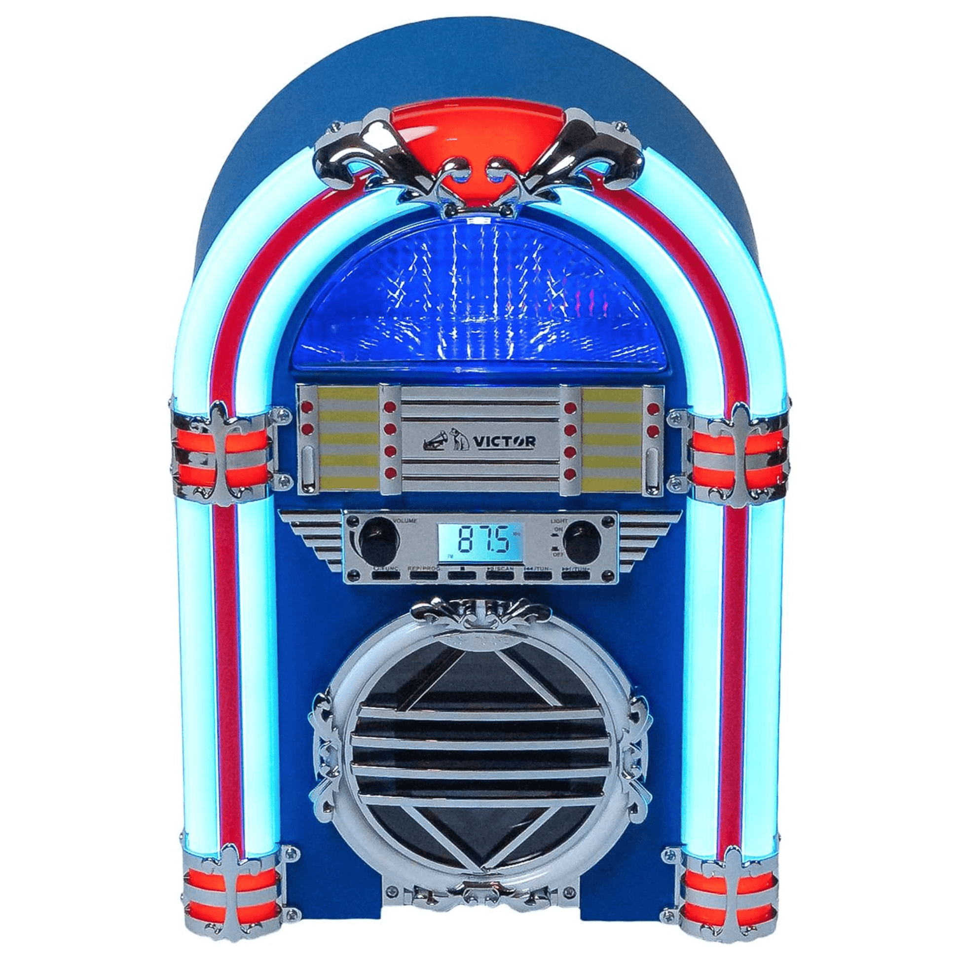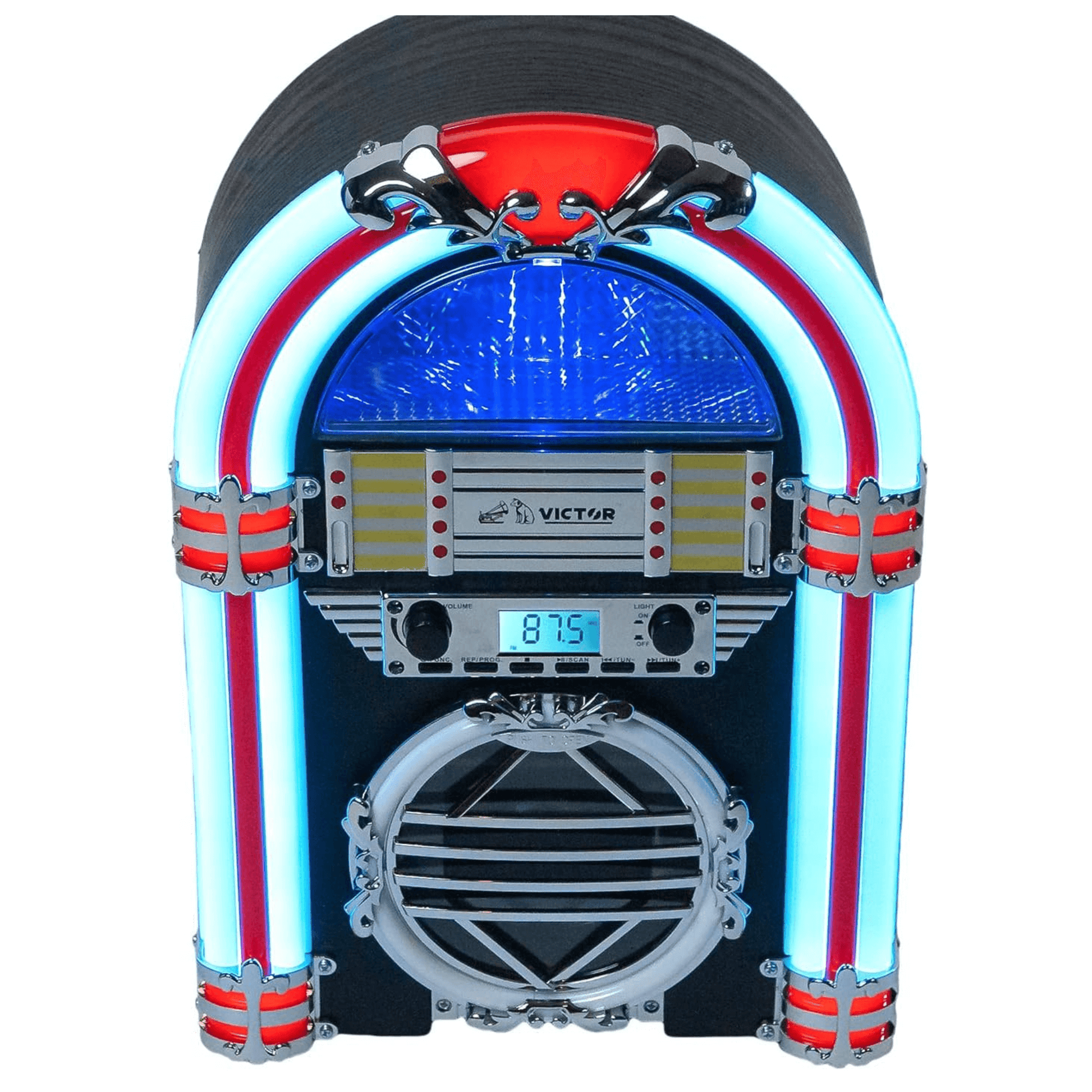 Broadway Desktop Bluetooth Jukebox features a Classic Jukebox Design all in a convenient size. The CD Player & FM Radio are ready to play your favorite Music. Bluetooth lets you stream music from your Smart Device through the Broadway’s built-in Speakers. The Multi-Mode Color Changing LED Lighting provides an eye-catching look.