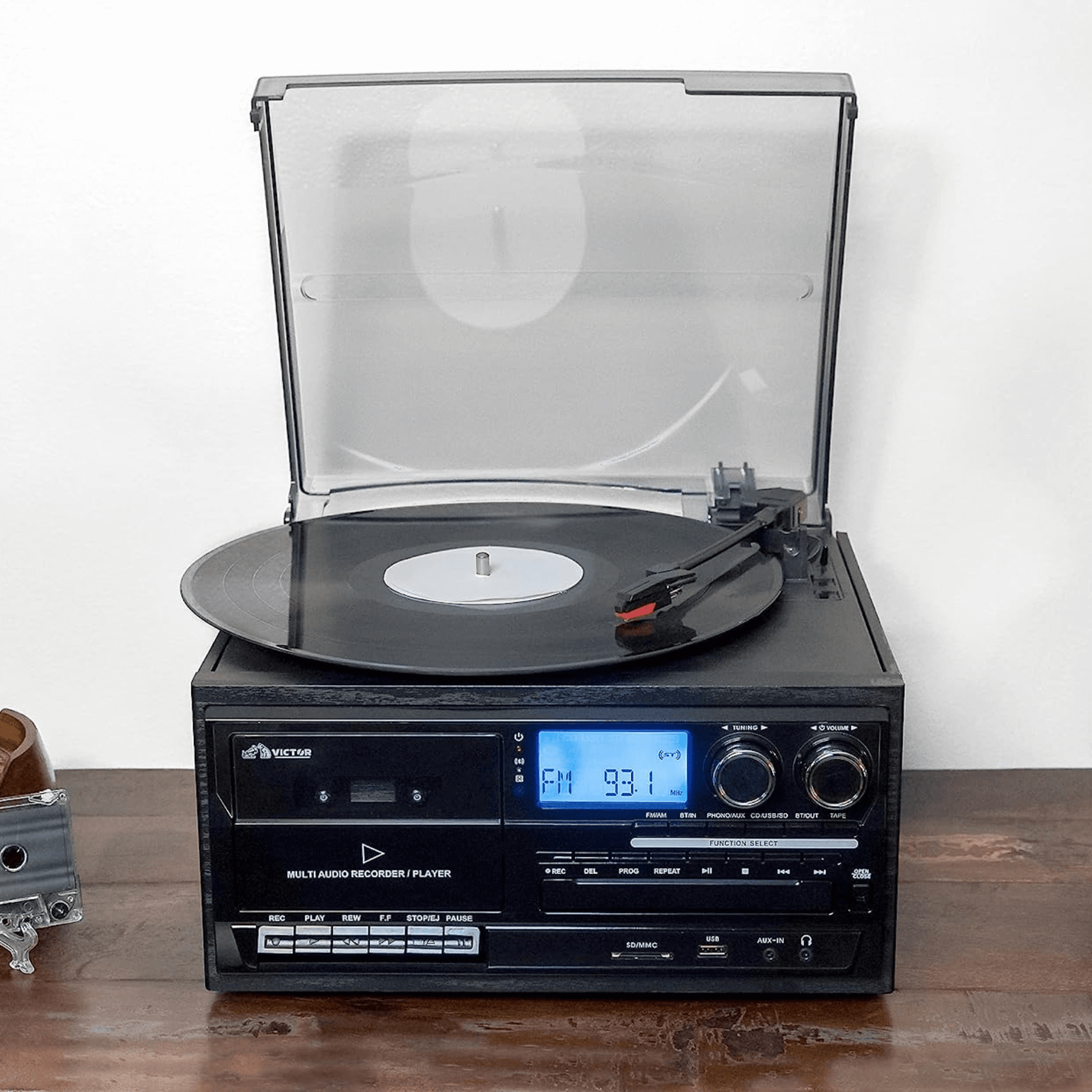 Cosmopolitan 8-in-1 Music Center features a uniquely Retro Design with a Metal Front Panel and Wood Sides. The built-in 3-Speed Turntable, CD and Cassette Player, and AM/FM Radio are ready to play all your favorite songs! The Dual Bluetooth feature allows streaming of your vinyl records to an external Bluetooth Speaker or plays music from your Smart Device through the Cosmopolitan's built-in Speakers. Placing a thumb Drive into the USB Slot allows Recording and Playback from your Albums, CDs, or Cassettes.