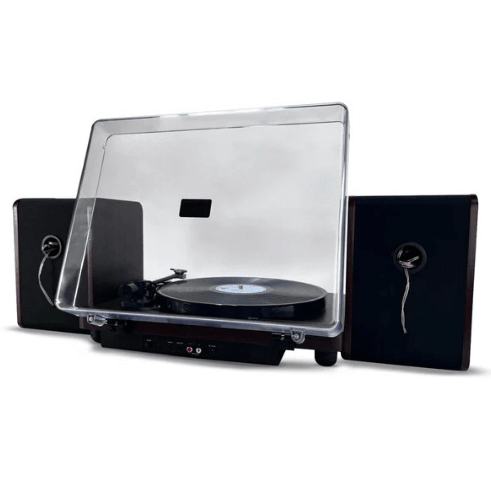 Experience the perfect blend of vintage charm and modern technology with our 3-Speed Turntable. This classic retro design plays all your favorite 33 1/3, 45, and 78 RPM vinyl records while allowing you to stream music, audiobooks, and podcasts wirelessly from your phone or smart device with Bluetooth IN, up to 33 feet away. The versatile connectivity includes 3.5mm LINE input and output for added flexibility, complemented by two external wired stereo speakers and independent main, treble, bass, and volume controls. Protect your device and records with the included hinged dust cover, ensuring they stay clean during playback and storage. Elevate your music listening experience with this stylish and functional turntable.
