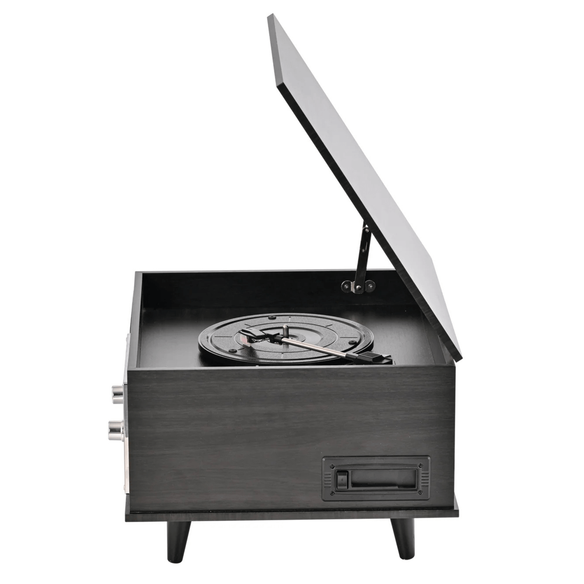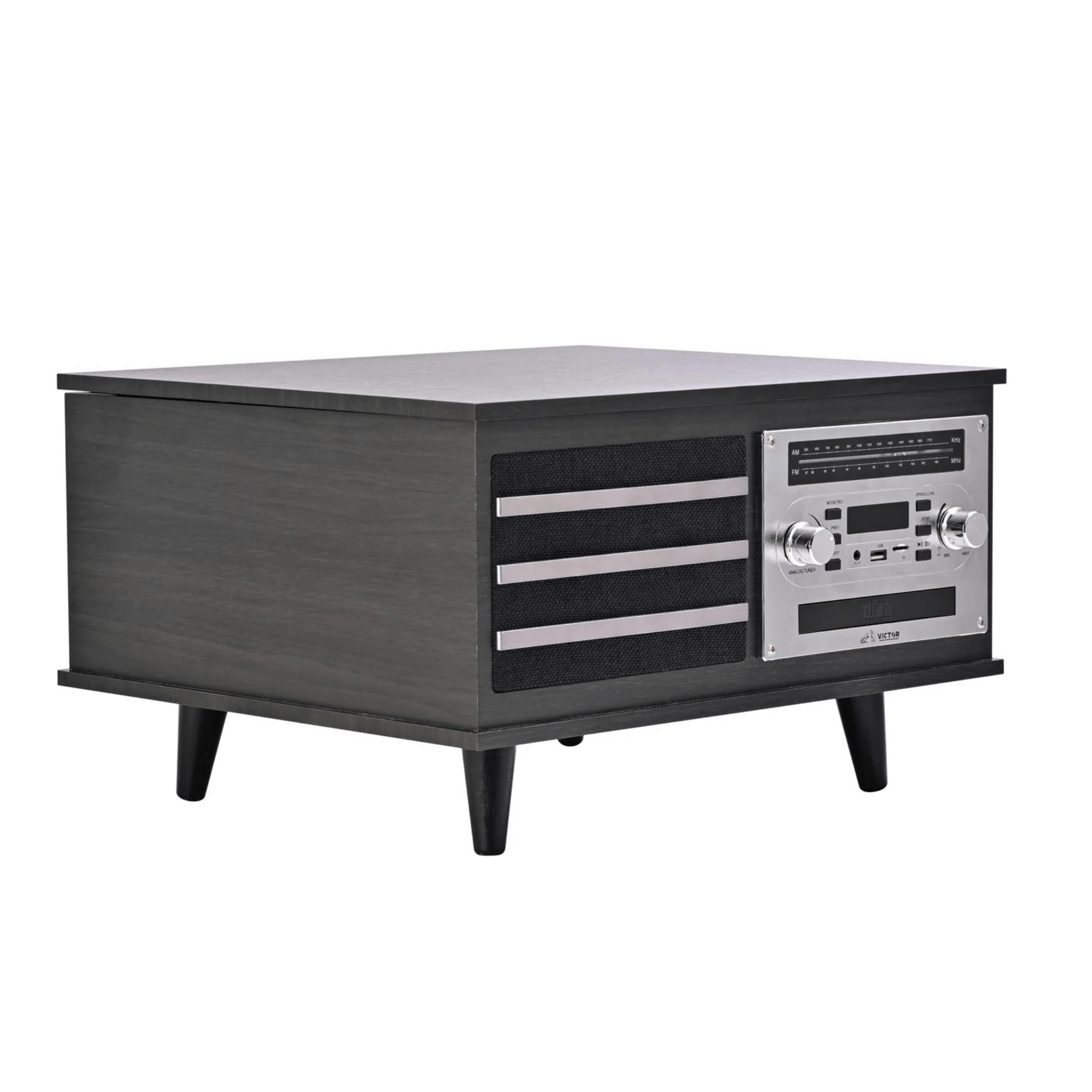 The Victor Monroe 8-in-1 Music Center is the ultimate all-in-one music hub, offering 8 different entertainment features in a single stylish device. Play your vinyl records with 33 RPM, 45 RPM, and 78 RPM speeds, listen to cassette tapes, CDs, or tune in to FM and AM radio - this turntable has it all. With Bluetooth In/Out functionality, you can stream music wirelessly from your phone or tablet, and connect to external Bluetooth speakers for enhanced sound. The elegant wooden cabinet with detachable legs brings a sophisticated retro vibe to any room, while ensuring portability and easy setup. Enjoy high-quality sound with high power output, and take advantage of features like TF Card, USB playing/encoding to digitize your vinyl collection, and Aux In for connecting additional devices. Whether you're a vinyl enthusiast or a casual music lover, this Monroe turntable player delivers versatile performance and timeless style in one convenient package.