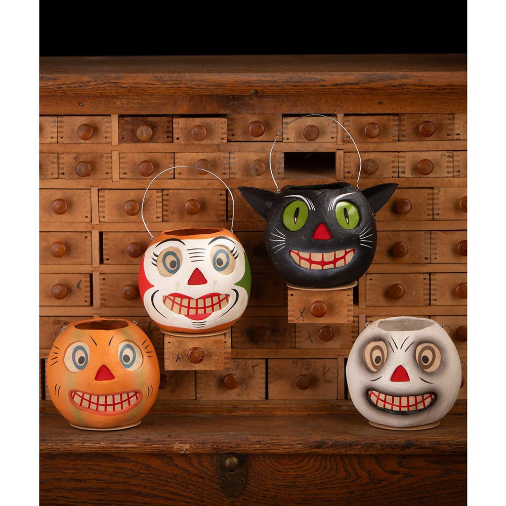 Embrace the playful spirit of Halloween with our Vintage Cat Bucket Small! This delightful reproduction captures the enchanting charm of the original design, bringing a touch of nostalgia to your Halloween decor. Crafted from high-quality paper mache, this adorable bucket features whimsical cat details that add a festive flair to any Halloween display. With convenient paper inserts, you can easily fill it with a flickering light or sweet treats, making it a perfect accent piece for your celebrations. Let this Vintage Cat Bucket Small be a purr-fect addition to your Halloween festivities! This piece is carefully antiqued and distressed by hand to give it a unique, vintage look. Each one is truly one of a kind, with slight variations that add to its charm and character. Light not included.