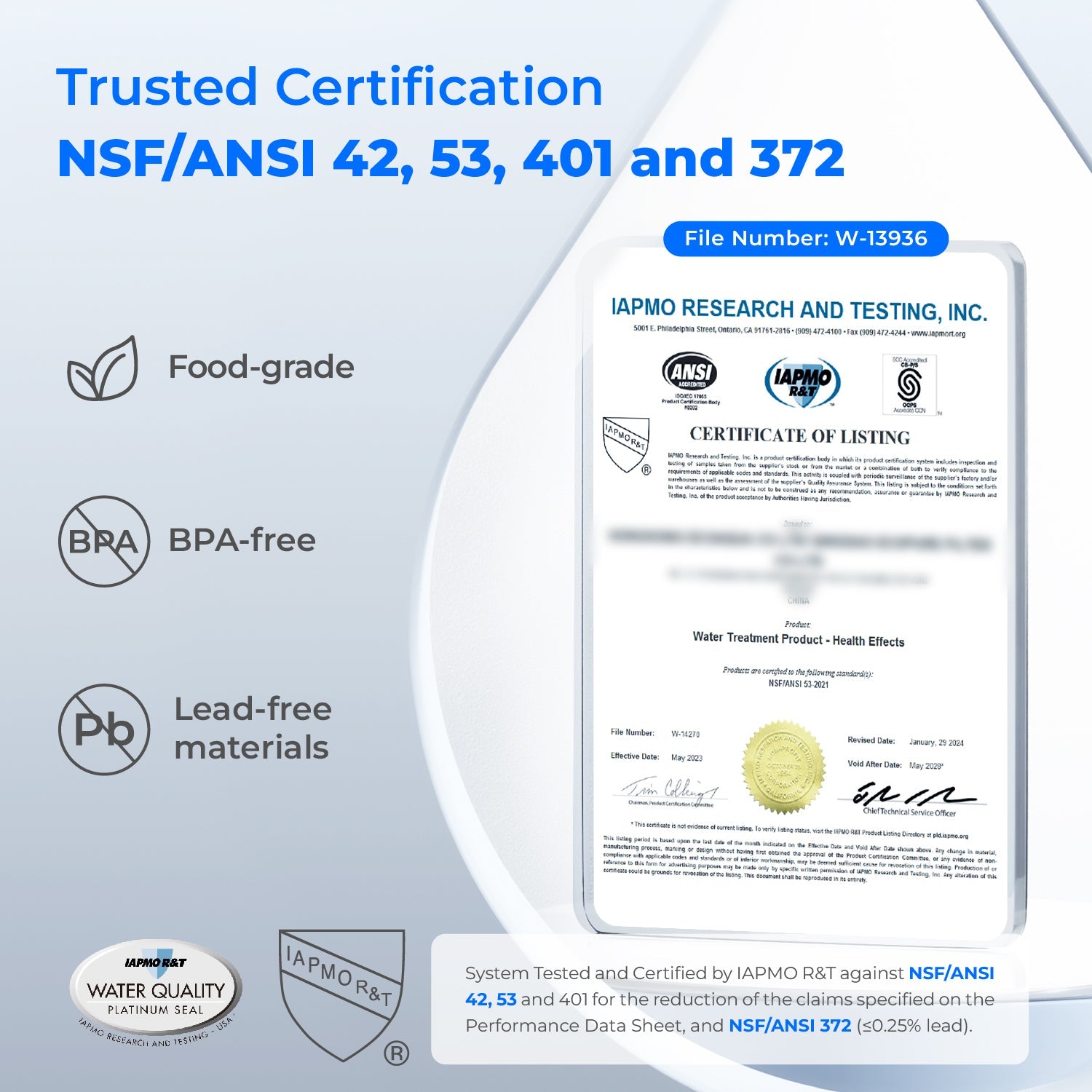 "System Tested and Certified by IAPMO R&T against NSF/ANSI 42,53 and 401 for the reduction of the claims specified on the Performance Data Sheet, and NSF/ANSI 372 (≤0.25% lead)."