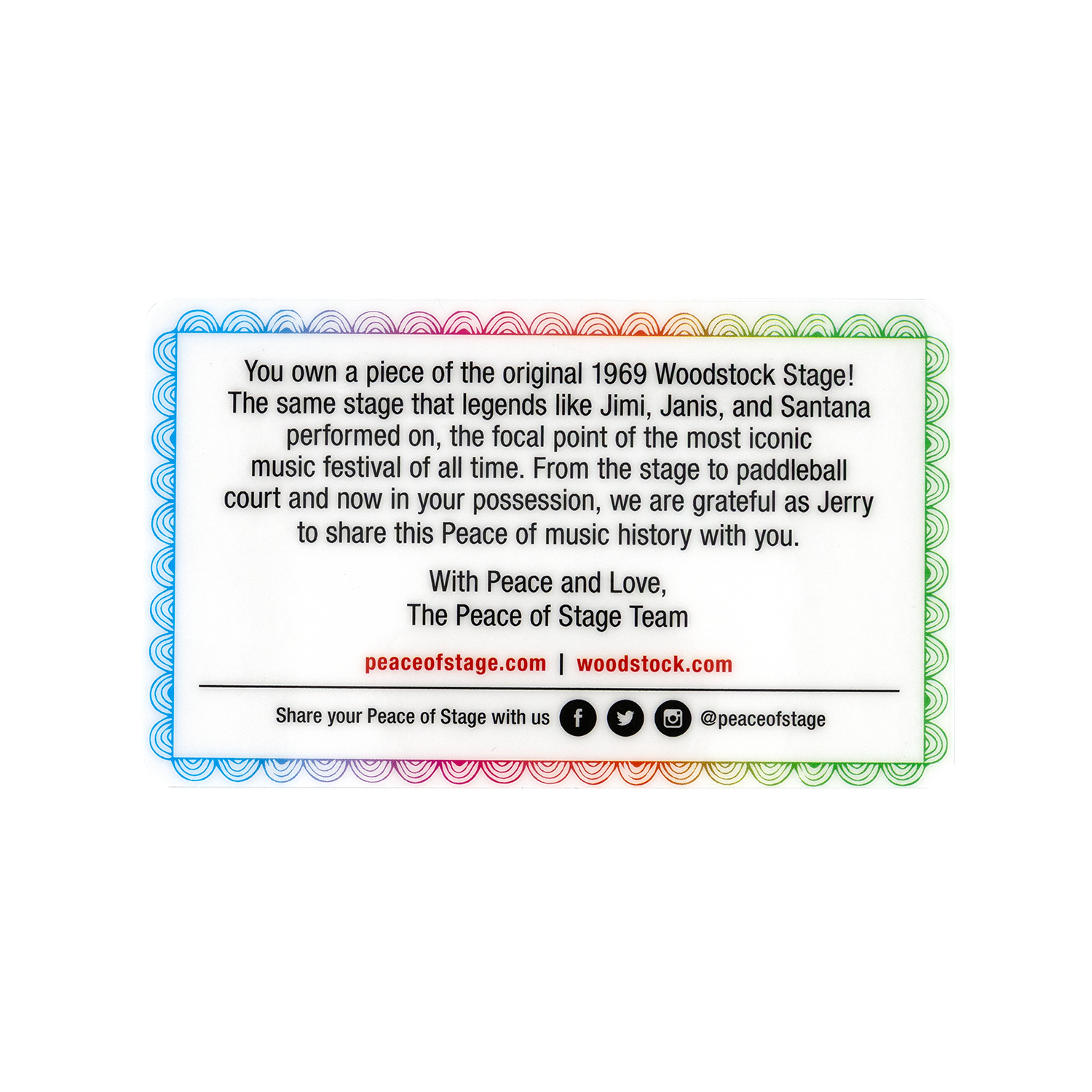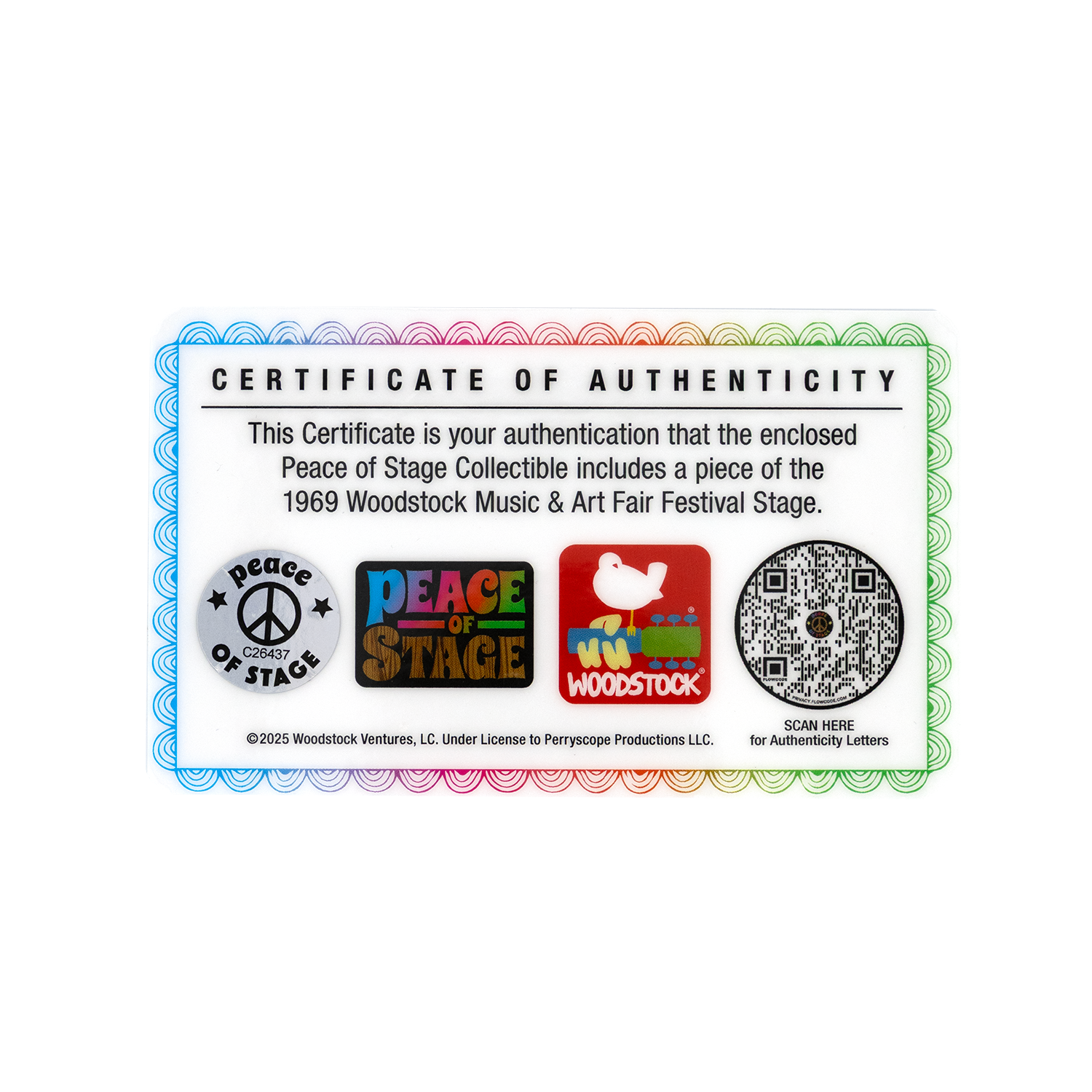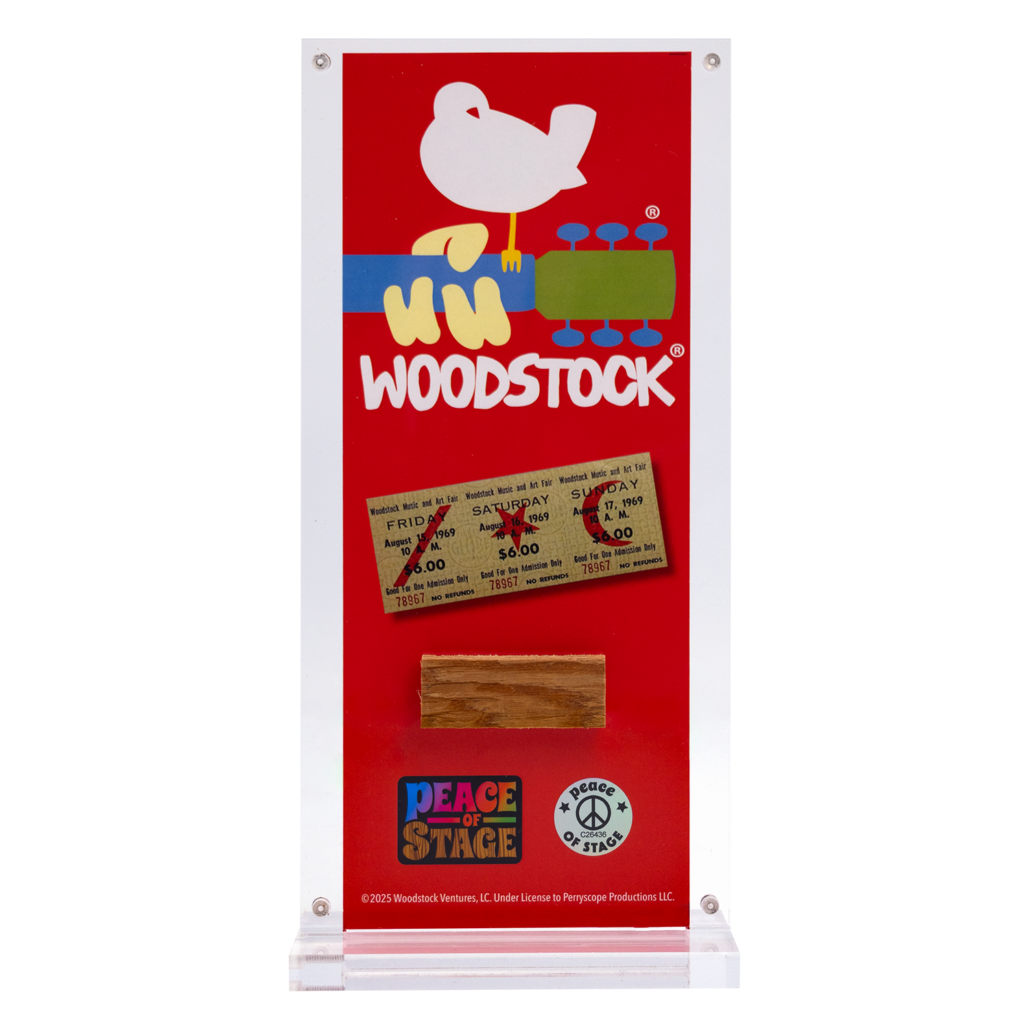 At the heart of this plexiglass is an authentic piece of the original 1969 Woodstock stage—the very platform where legendary artists performed their unforgettable sets. Each banner includes a certified ‘Peace of Stage’ wooden piece, making it a truly unique and meaningful keepsake for music lovers, collectors, and Woodstock enthusiasts.