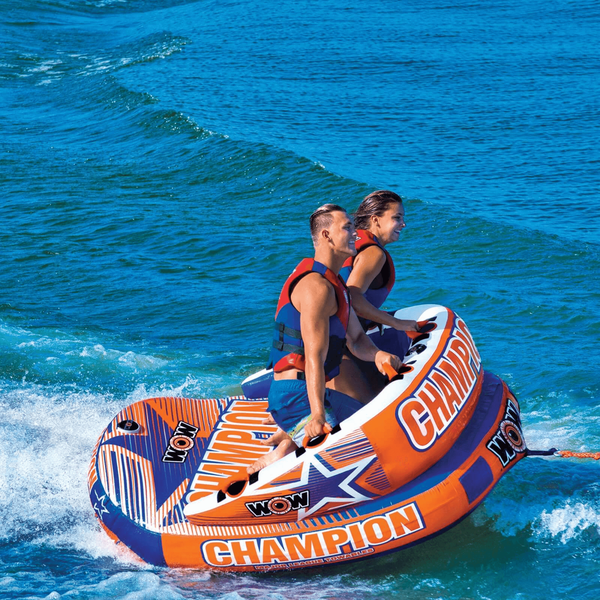 Be a Winner on the Water this Summer. The Champion 2 is a towable that has been designed and worked in over time — to fit like a glove. The EZ-Up Nose on the Champion allows for minimal drag, making takeoffs a breeze, a footrest for lounging or a spray blocker for the riders while in action. The side rests are EXTRA long to protect the riders. Padded protection means- NO shoulder pads needed! Load your bases onto the SECURE DECK SEATING; get thrown into the outfield anyways? The Champion is made with great boarding leverage points to get right back to the game! This is the winning series when it comes to family towables. WOW, blowing the competition out of the water, again and again.