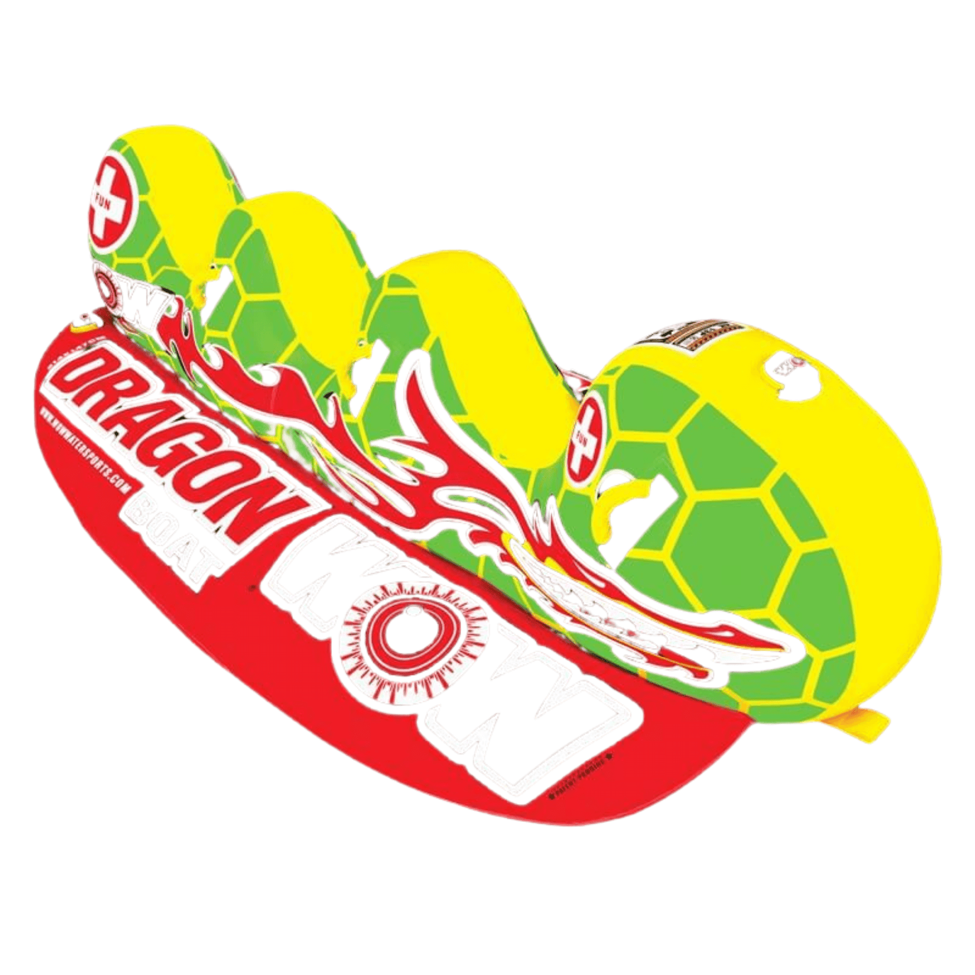 The banana boat style towable tube was invented in 1984 and became one of the most popular towable tubes for boating of all time. Millions were sold but nothing new has ever been done to improve their performance until now. WOW introduces a new improved version of the banana boat style inflatable towable that gives each rider their own cockpit with backrest to separate each rider and hold them on the tube. We have also doubled the width of the side pontoons. All of these features improve the stability and safety of this style of towable tube for boating. The wider side pontoons also make this item very easy to get on while in the water. We have created a great new look with the Dragon Boat which is a lot more fun than the original torpedo. The Dragon Boat is one of the perfect 3 person towable tubes on the market for a fun, safe ride for people of all ages. One of the great inflatable towables for the family.