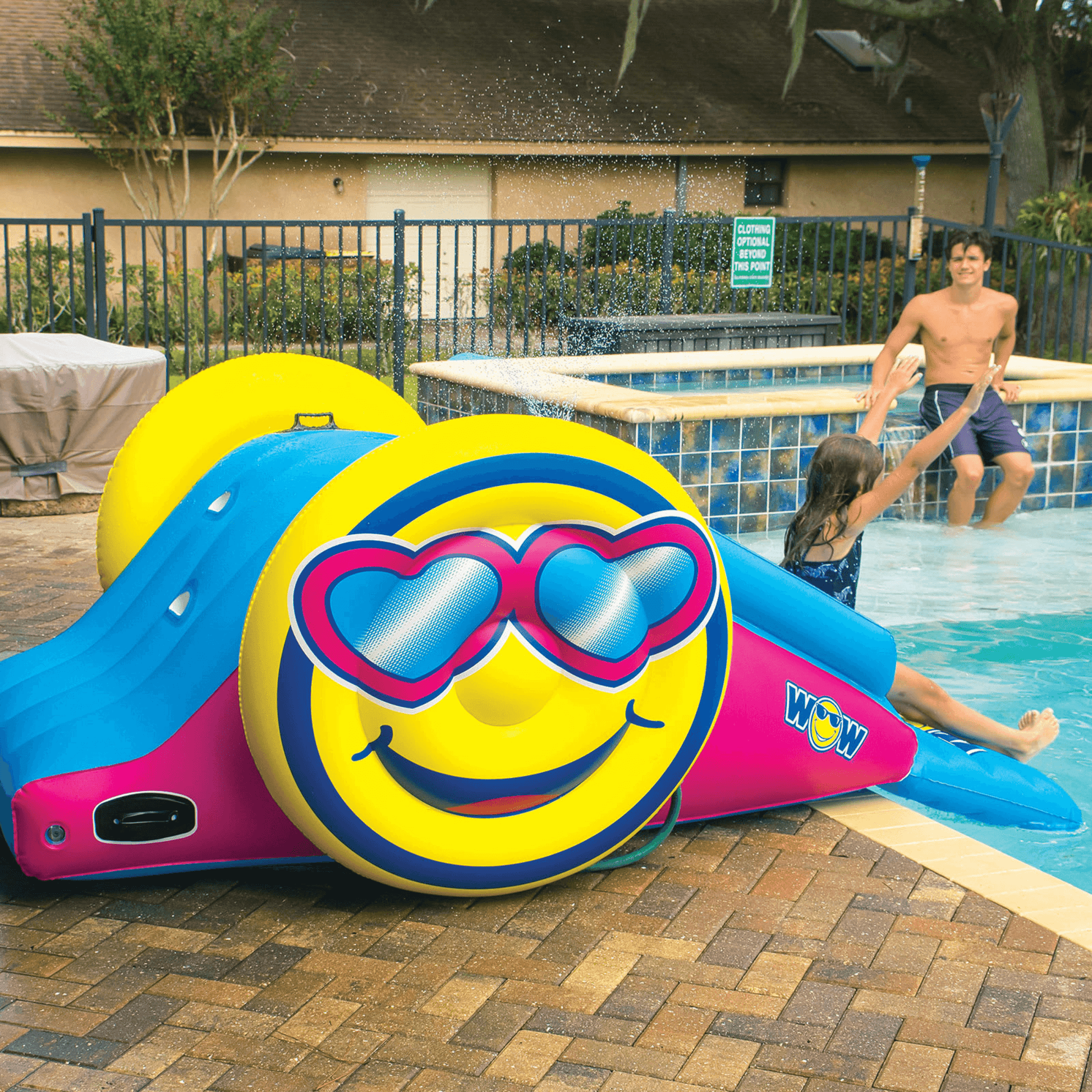 Add FUN to any pool with WOW's FUN Pool Slide. This easy-to-set-up inflatable has WOW water ballast pontoons for secure stable sliding. Built-in soaker sprinkler creates a wet fast sliding surface that connects easily to any standard garden hose. EZ boarding step design with molded handles. At the bottom of the slide, there is a WOW slide bumper for easy entry into the water.
