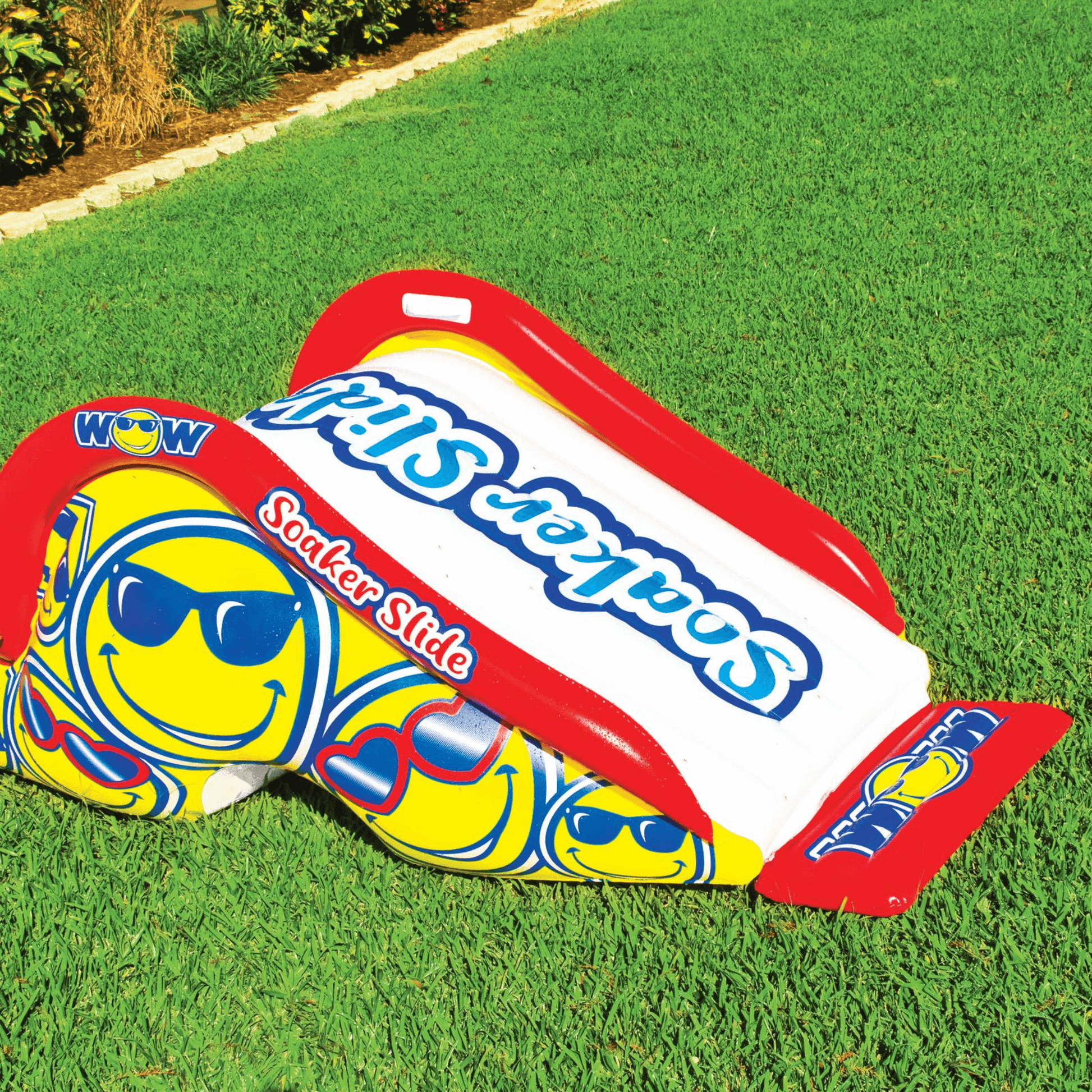ADD to your PAD with WOW's Soaker Splash Pad Slide. This easy-to-set-up inflatable has a tunnel that fits over the pontoons of our WOW Splash Pads for secure stable sliding. Built-in soaker sprinkler creates a wet fast sliding surface that connects easily to any standard garden hose. EZ boarding step design with molded handles. At the bottom of the slide, there is a WOW slide bumper for easy entry into the water.