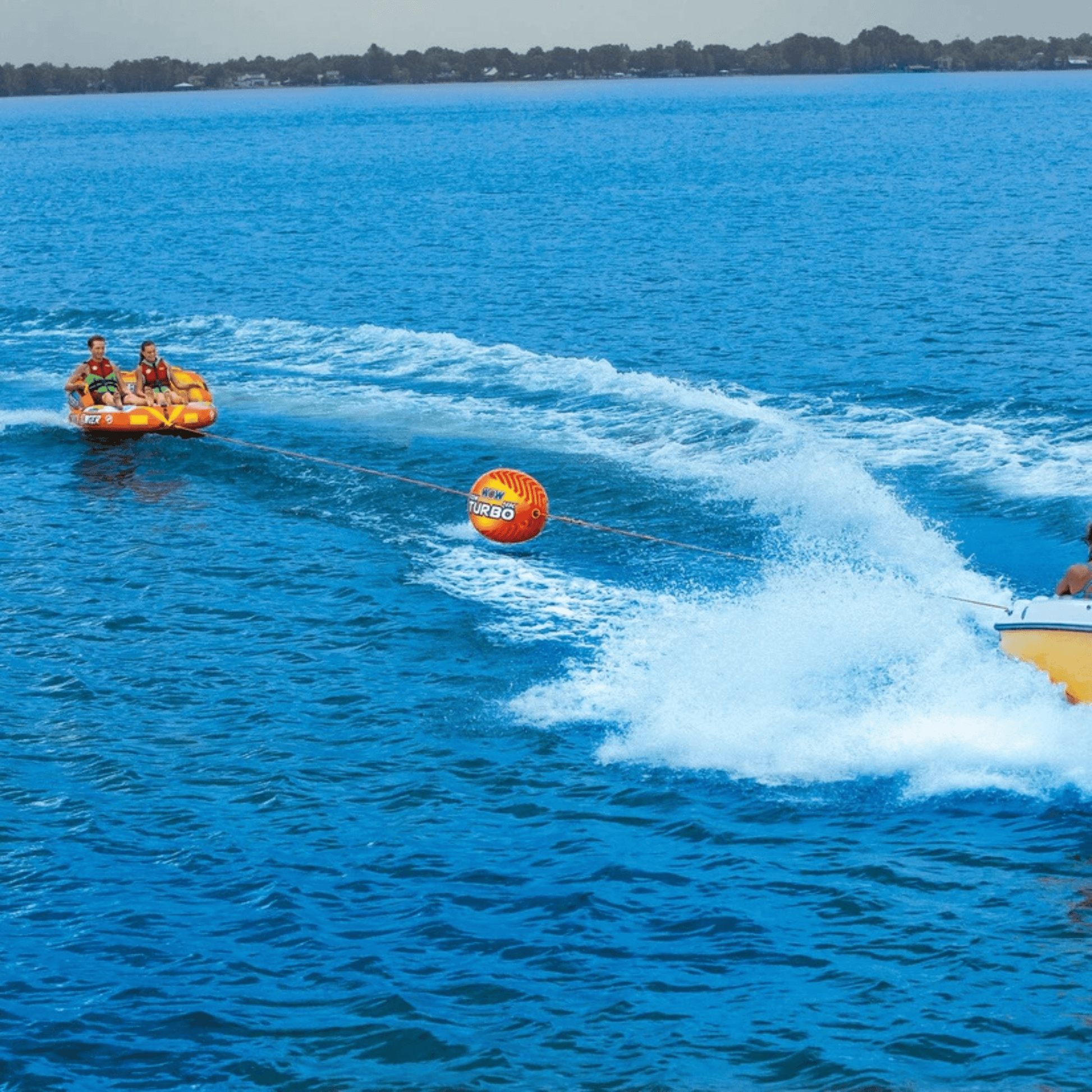The WOW Watersports 4k Tow Turbo will help keep the rope out of the water and wake, absorb shock and enhance fuel economy, reduce the submarine effect for easier takeoffs, reduce stress on the tube and cover, keep the rope straighter, reduce rope spray, and increase visibility of the rope in the water.