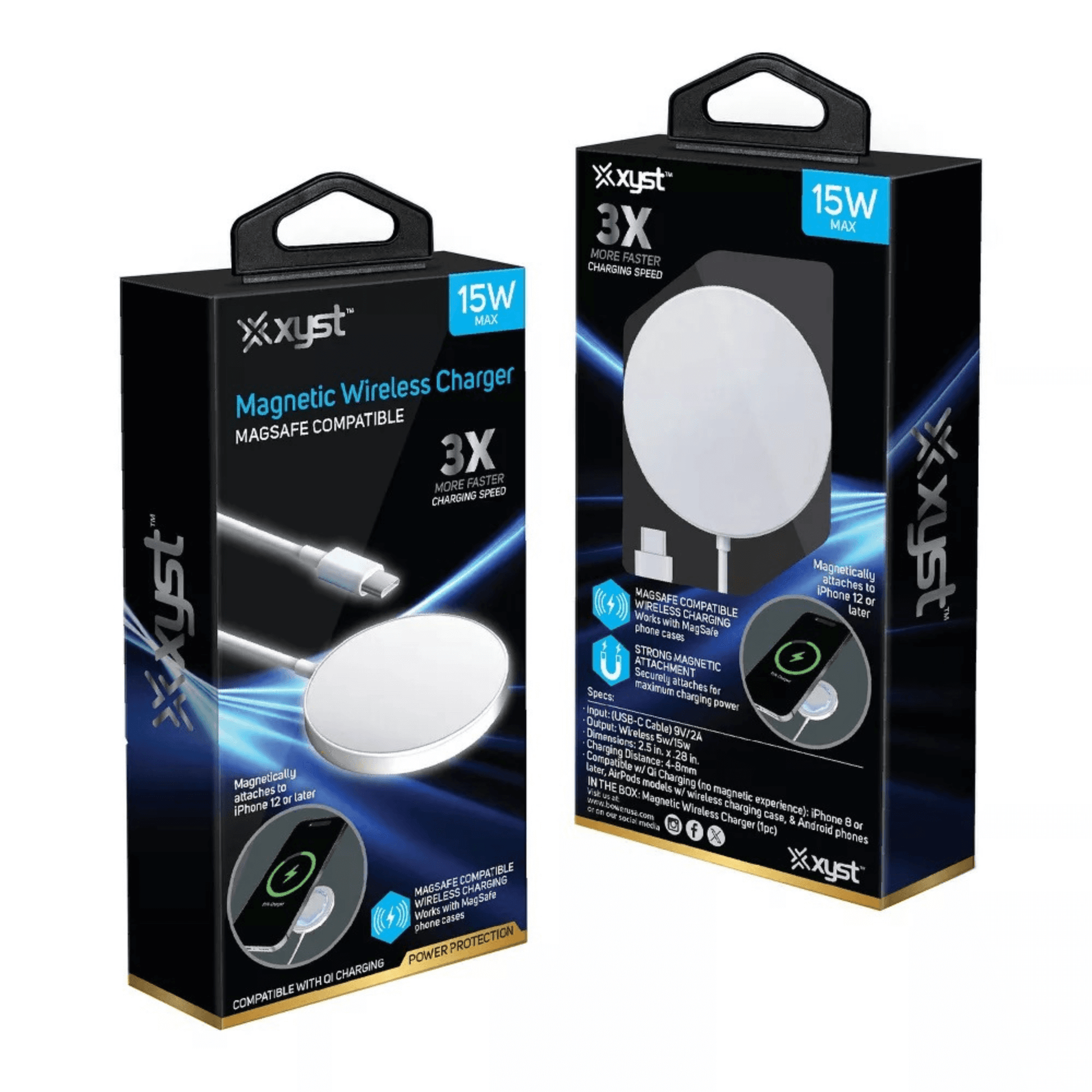 The XYST Magnetic Wireless Charger offers effortless and efficient charging with MagSafe compatibility for a secure and seamless connection. Delivering up to 15 watts of wireless power, it ensures fast and reliable charging while keeping your device firmly in place with a strong magnetic attachment. Designed for convenience, this charger allows uninterrupted use of your device while powering up. Equipped with a USB-C input supporting 9V/2A, it provides a dependable and rapid charging experience, making it an essential accessory for your daily power needs.