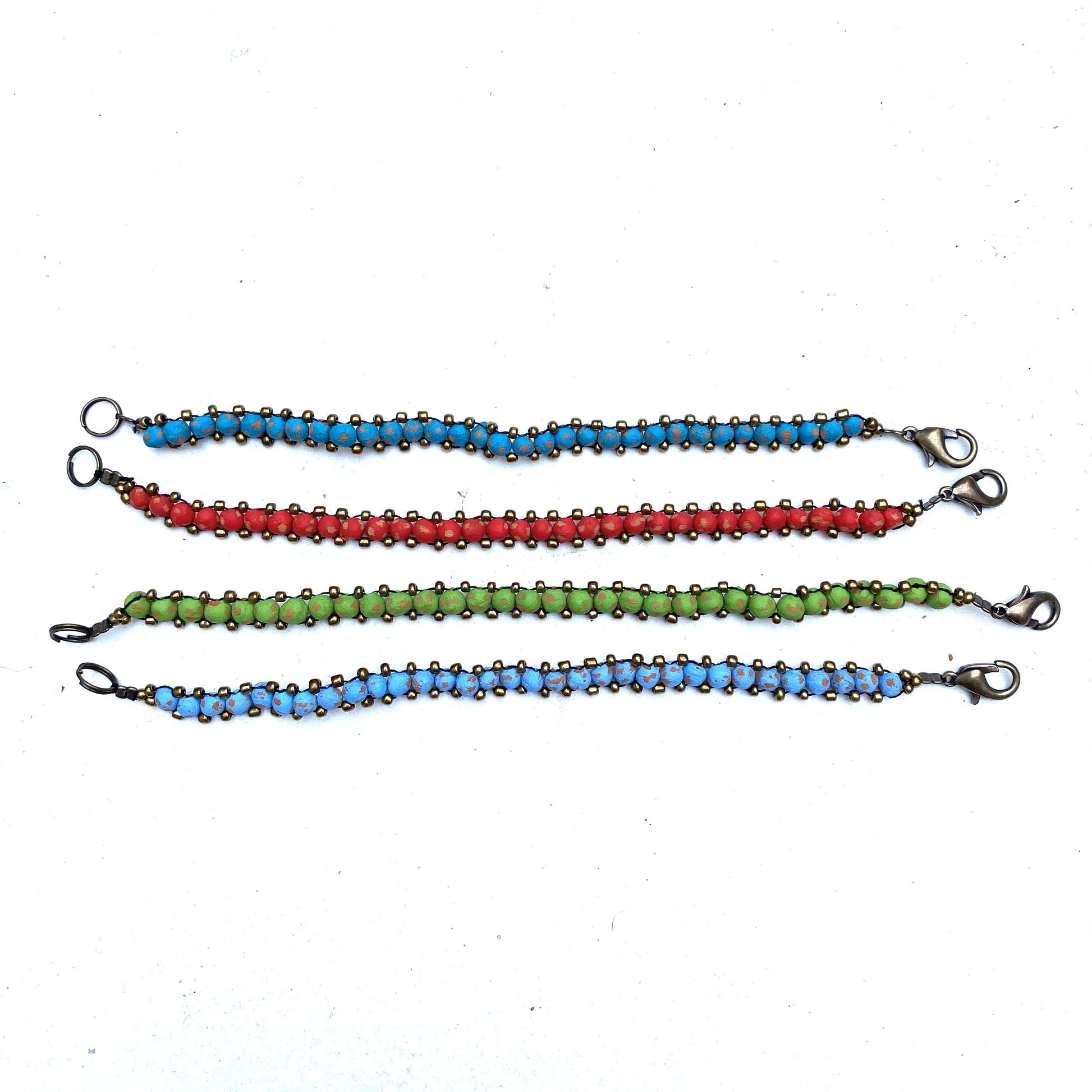 A favorite clasp bracelet weaving tiny micro ceramic beads with bronze seed beads.
